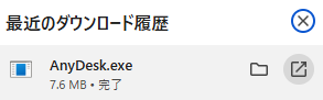 - ダウンロード完了後、画面右上に表示されるダイアログボックスより、「AnyDesk.exe」または「ファイルを開く」ボタンをクリックします。