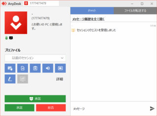 - 担当者が接続操作を開始すると表示されるAnyDeskの画面の「承諾」をクリックします。この時点でリモート接続が開始します。