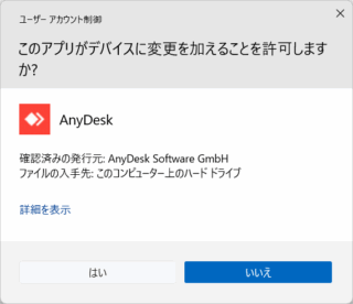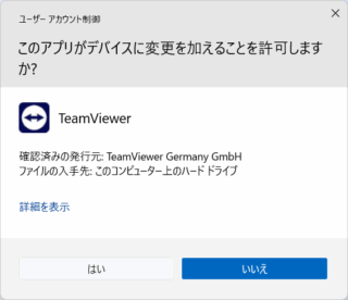 - ユーザーアカウント制御画面が表示されますので、「はい」をクリックします。